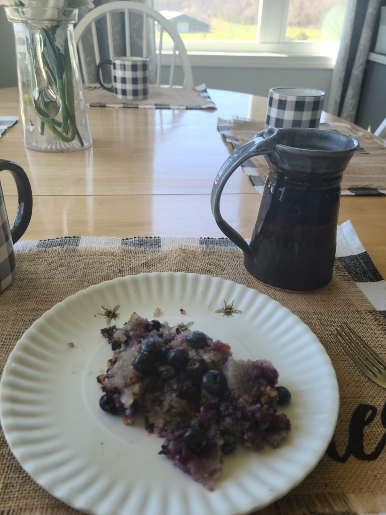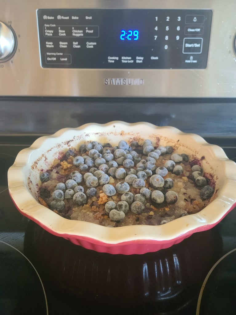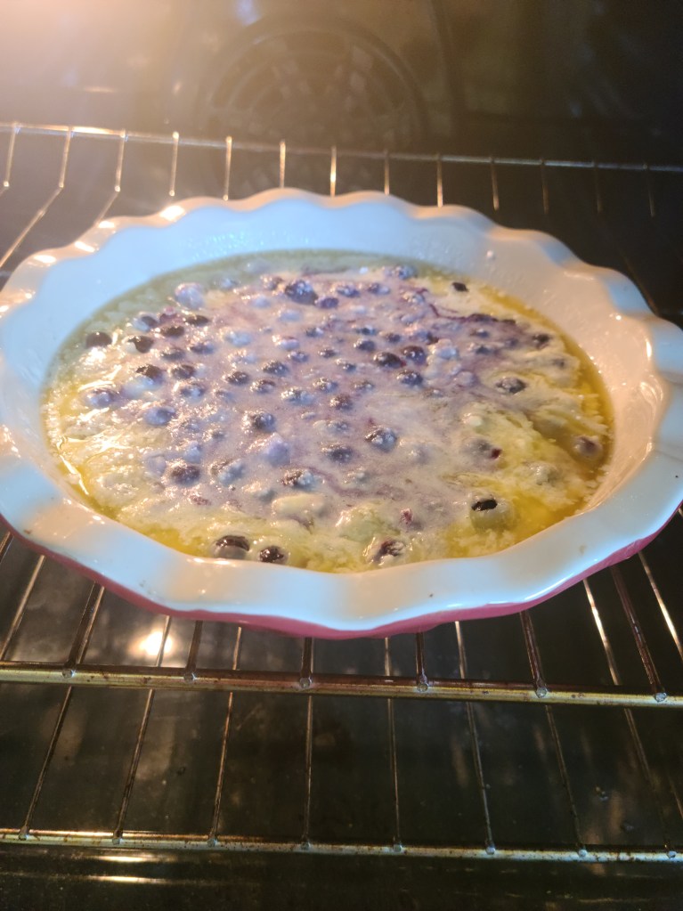 Well, I didn’t have any Blackberrys and I don’t know how to make a tart SO I decided on Aunt Bonnie’s Bluebery cobbler.